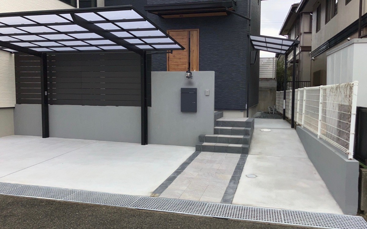 テラス屋根:(LIXIL)スピーネF 3m×5m 柱:ブラック 板:シックグレー
